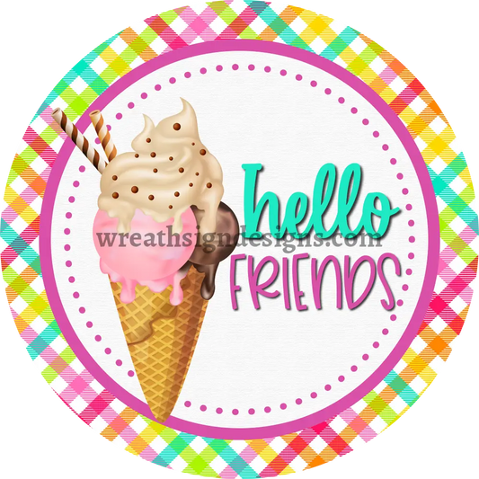 Hello Friends Ice Cream on Summer Plaid Metal Wreath Sign MS-1219