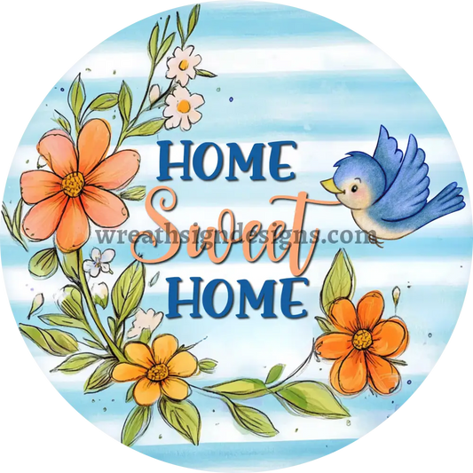 Home Sweet Home Blue Bird and Flowers Peach and Blue Round Metal Wreath Sign MS-1208