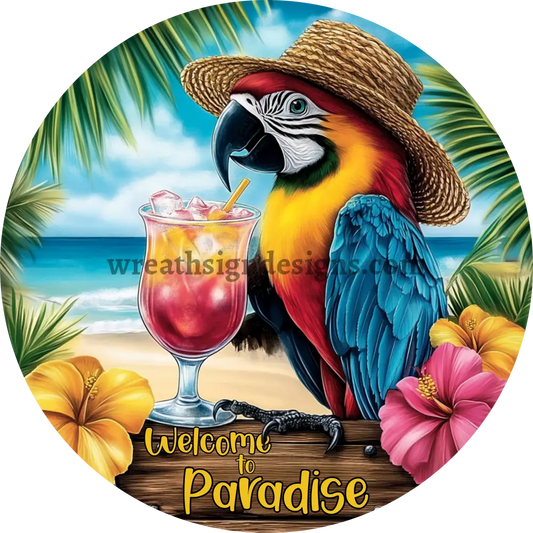 Welcome to Paradise Tropical Parrot - summer beach wreath sign Round Metal Wreath Sign MS-1223
