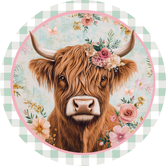 Floral Highland Cow Mint and Peach- Metal wreath Sign MS-1063