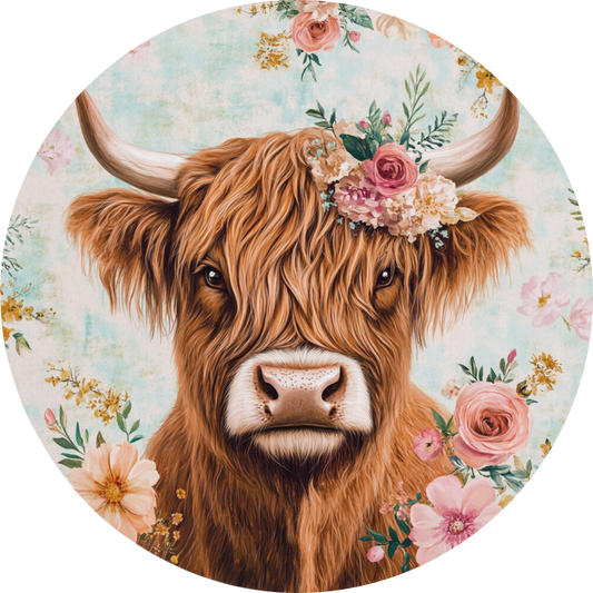 Floral Highland Cow Mint and Peach- Metal wreath Sign MS-1064