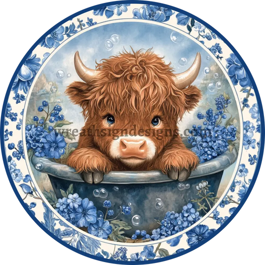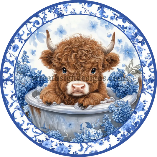 Highland Cow Blue Floral tub- Metal wreath Sign MS-1047