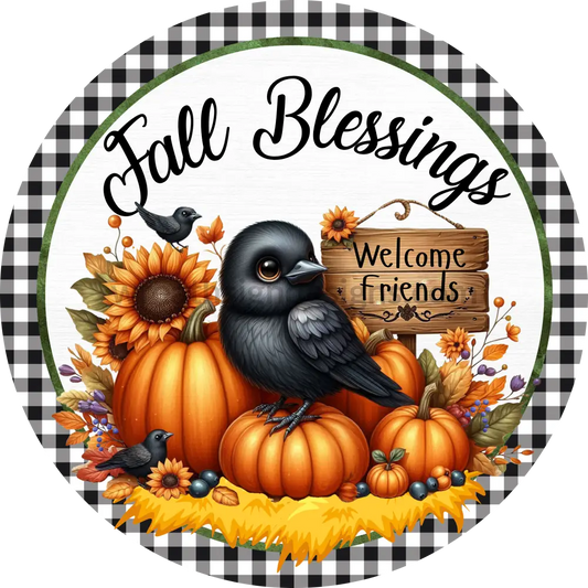 Fall Blessing Welcome Friends Blue Toile Pumpkins-Metal Wreath Sign