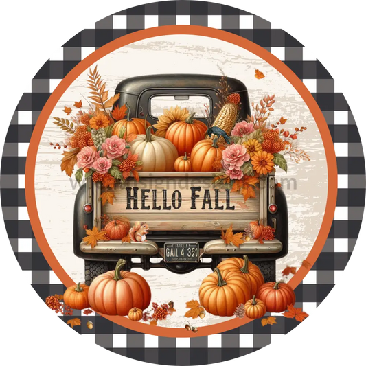 Hello Fall Black Vintage Pumpkin Truck Round Metal Wreath Sign