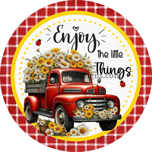 Enjoy the Little Things Daisy and Ladybug Vintage Truck Metal wreath Sign