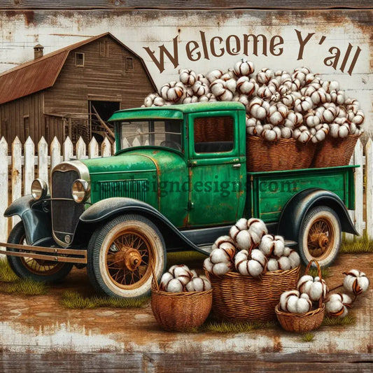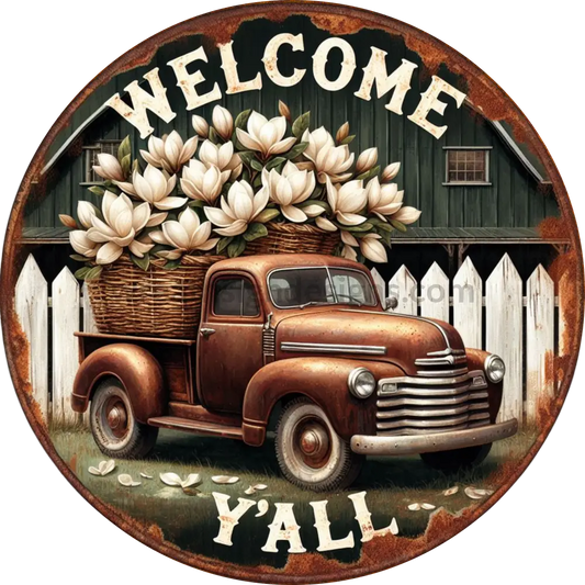 Welcome Y'all Vintage Magnolia Truck Metal Wreath Sign