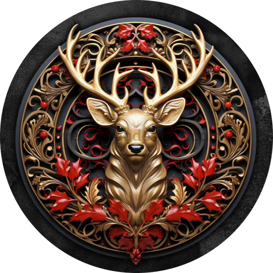 Winter Deer With Gold Ring and Poinsetttias Round Metal Wreath Sign