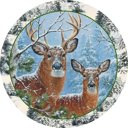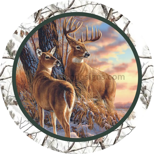 Winter Sunset Deer Buck and Doe Round Metal Wreath Sign