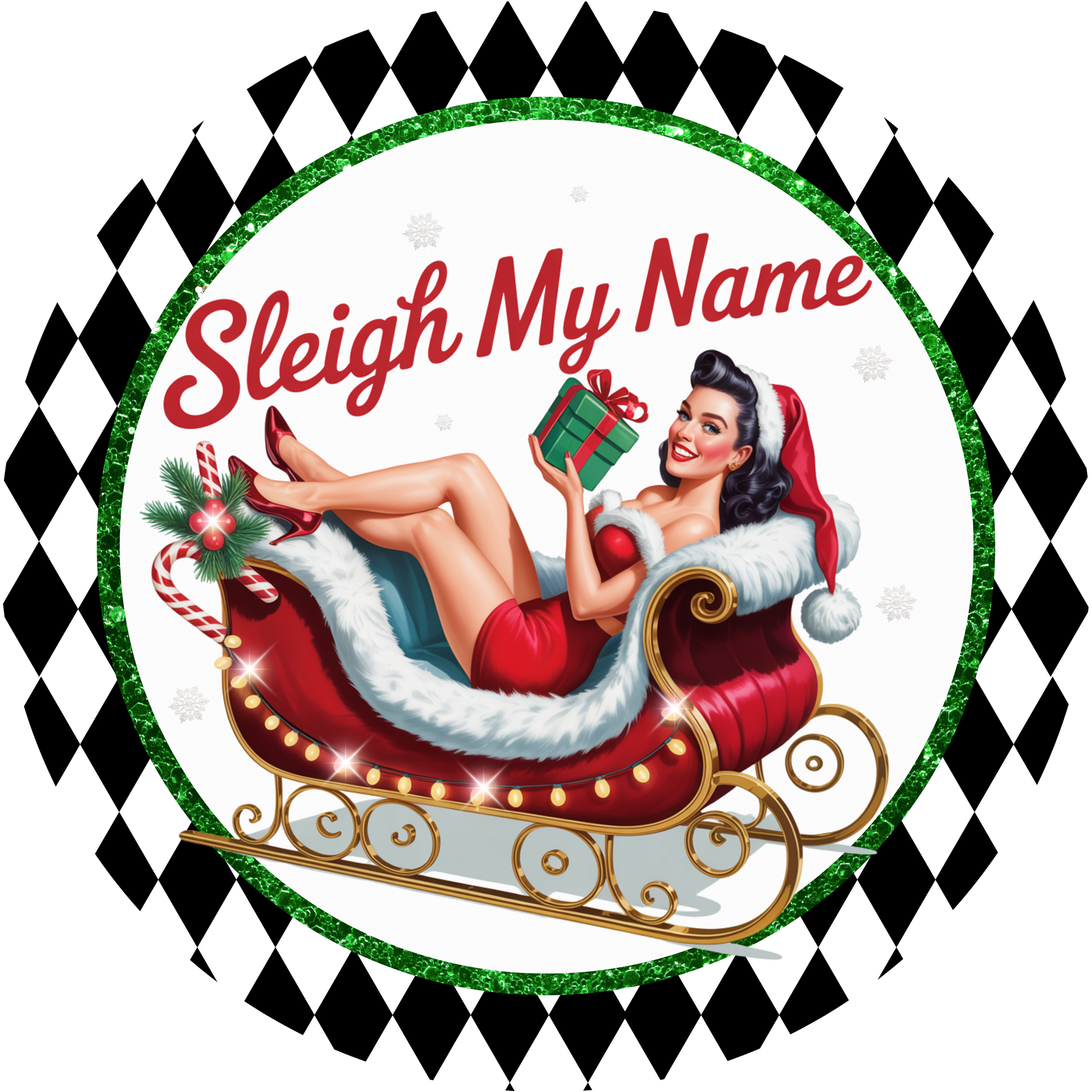 Add a bold and playful twist to your next holiday wreath with this “Sleigh My Name” Christmas sign. Featuring a glamorous vintage pinup in a red Santa suit, high heels, and a Santa hat, she lounges across a festive sleigh while holding a wrapped gift. The retro artwork pops with classic pinup charm and a sassy holiday vibe, making it the perfect centerpiece for wreath makers who want their creations to stand out.